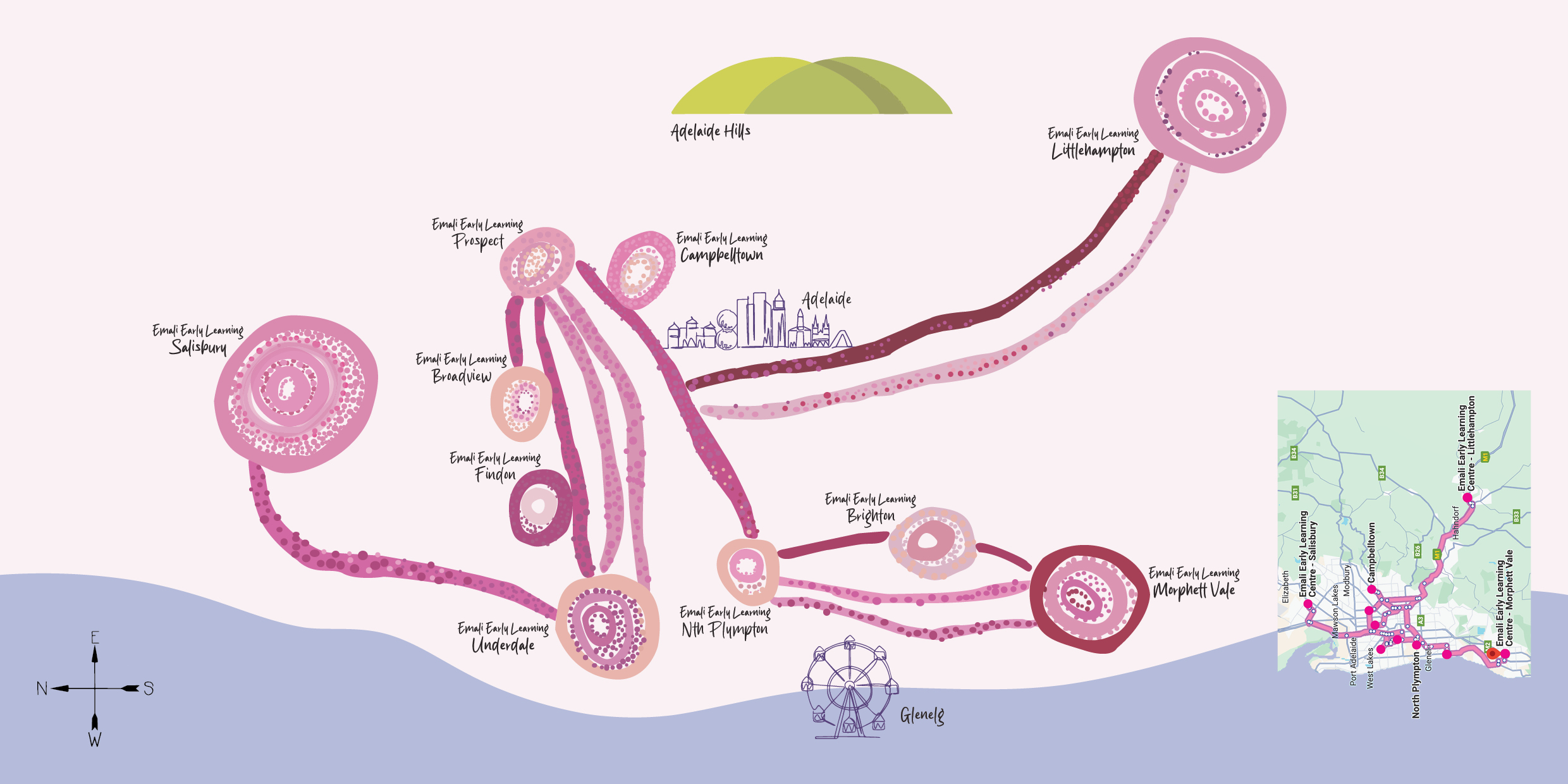 The layout of the painting reflects the geographical spread of Emali’s centres, weaving them into a narrative that highlights both place and purpose. Using the visual language of her Anmatyerre and Alyawarre heritage, Charmaine incorporated motifs that speak to children’s joy and to the deep sense of belonging created within Emali’s nurturing environments. As a mother, she approached the project with empathy and understanding, designing a work that is engaging for young minds while carrying the weight of tradition and storytelling passed down for generations.