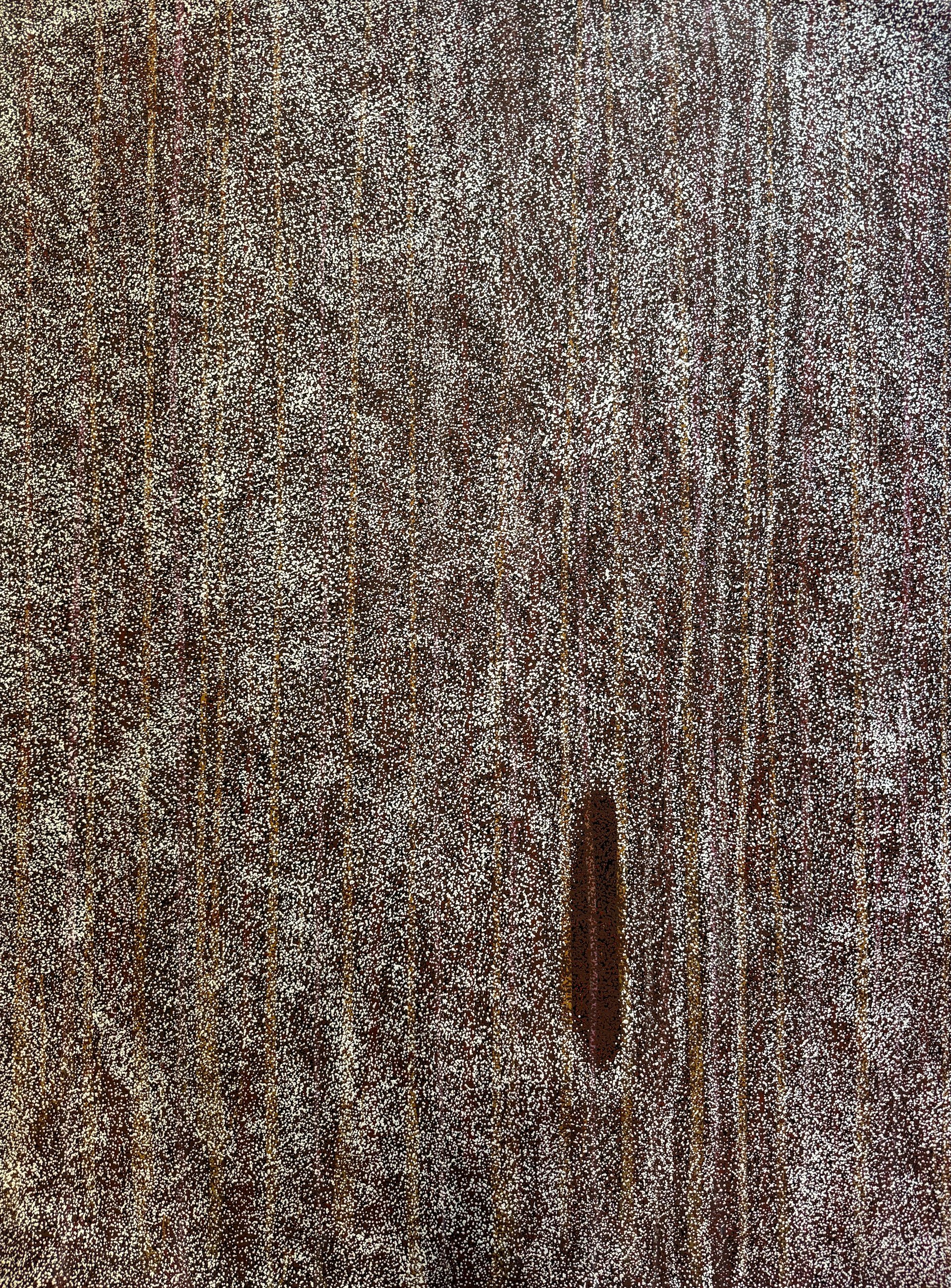 My Mother’s Country is Barbara Weir’s deeply personal and cultural tribute to Atnwengerrp — the land of her mother, Minnie Pwerle. Through intricate dotwork and layered symbolism, Barbara maps the physical and spiritual landscape of the Utopia region. Flowing rivers, abandoned campsites, bush tucker, coolamans, and ceremonial sites appear within the shimmering surface, revealing a rich narrative of life, survival, and connection. The Sandover River often winds through her canvases, linking sacred places such as natural clay basins, white quartz hills, and areas marked by seasonal flooding and regrowth.