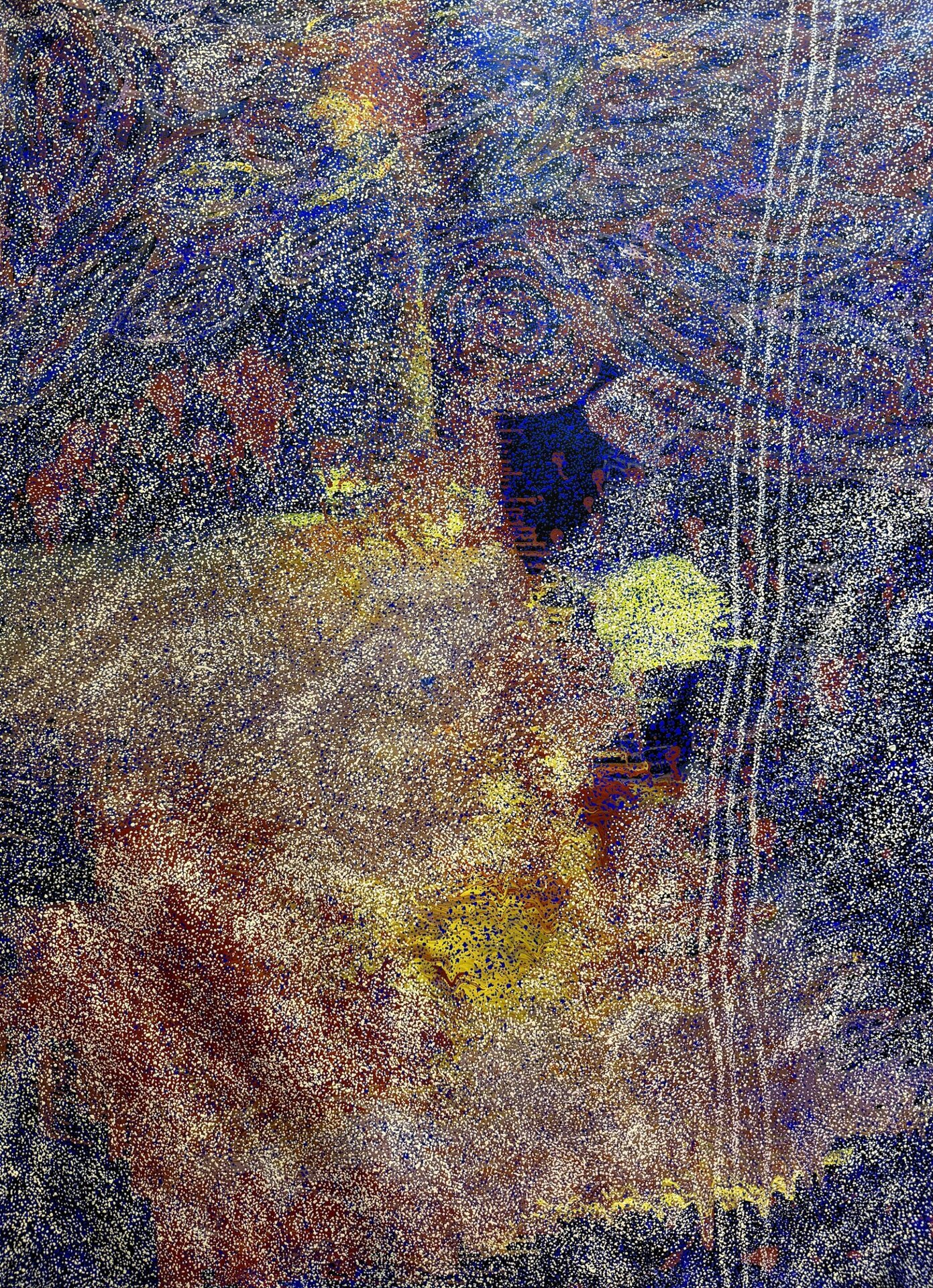 My Mother’s Country is Barbara Weir’s deeply personal and cultural tribute to Atnwengerrp — the land of her mother, Minnie Pwerle. Through intricate dotwork and layered symbolism, Barbara maps the physical and spiritual landscape of the Utopia region. Flowing rivers, abandoned campsites, bush tucker, coolamans, and ceremonial sites appear within the shimmering surface, revealing a rich narrative of life, survival, and connection. The Sandover River often winds through her canvases, linking sacred places such as natural clay basins, white quartz hills, and areas marked by seasonal flooding and regrowth.