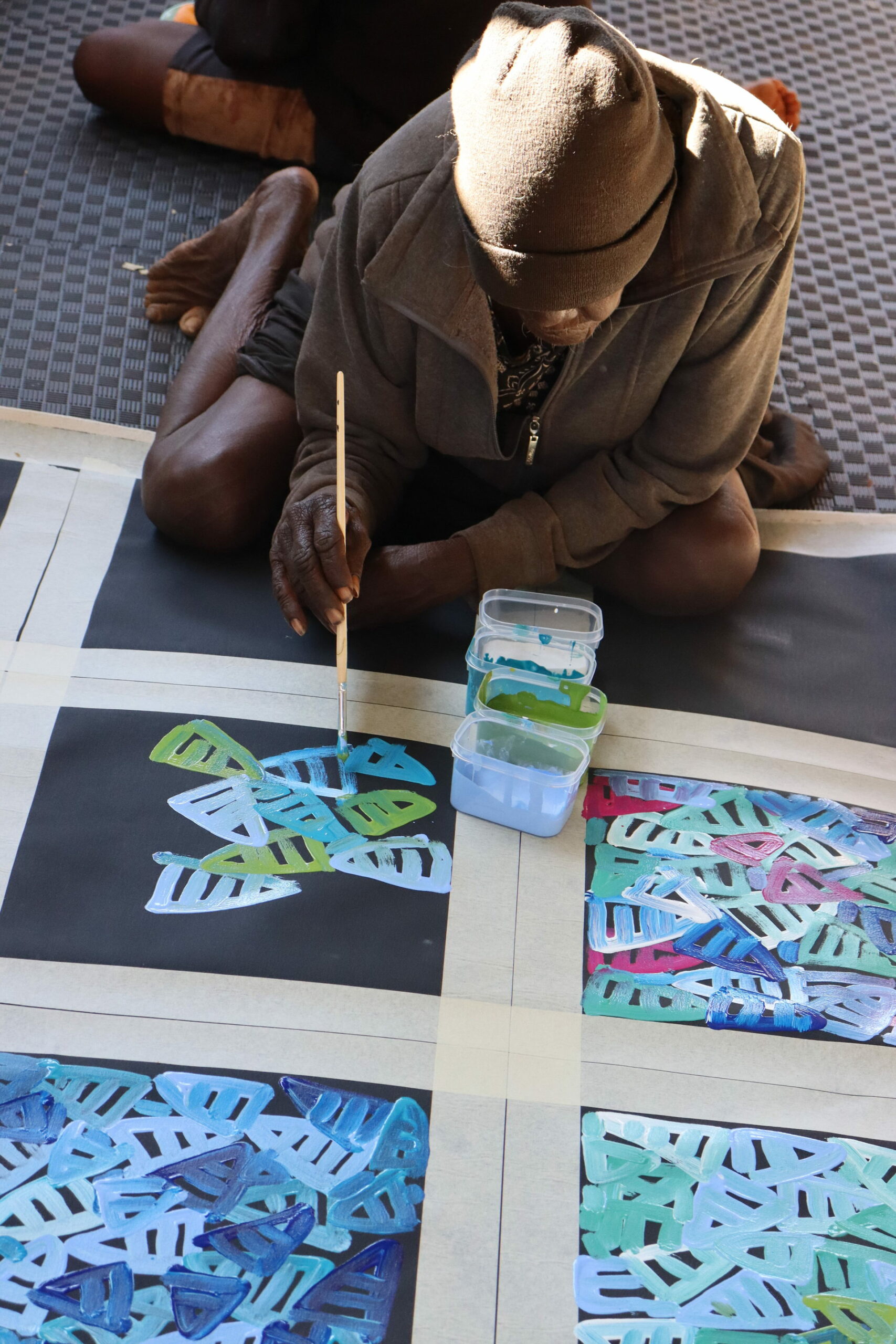 Her work centres on Awelye Atnwengerrp—women’s ceremonial body designs—rendered in vibrant, gestural lines and layered patterns. Using bold acrylic colours, she reinterprets the ochre markings traditionally painted on women’s bodies for ceremony, as well as the rich colours of her Country. Many of her paintings also celebrate the Bush Melon Dreaming, an important and rare desert food from Atnwengerrp.