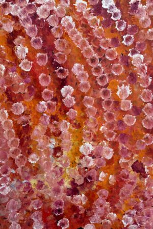 Freddy Purla’s Dreaming, My Grandmother’s Country, honours his ancestral land at Atnwengerrp in Utopia, Northern Territory, and the legacy of his great aunt, Emily Kame Kngwarreye. Through his signature ‘dub dub’ style, Purla captures the heat, seasons, wildflowers, and sacred sites of Country, embedding stories of bush tucker, ceremony, and ancestral journeys. Each work is a visual songline — a tribute of gratitude to the land that has sustained his family for thousands of years.