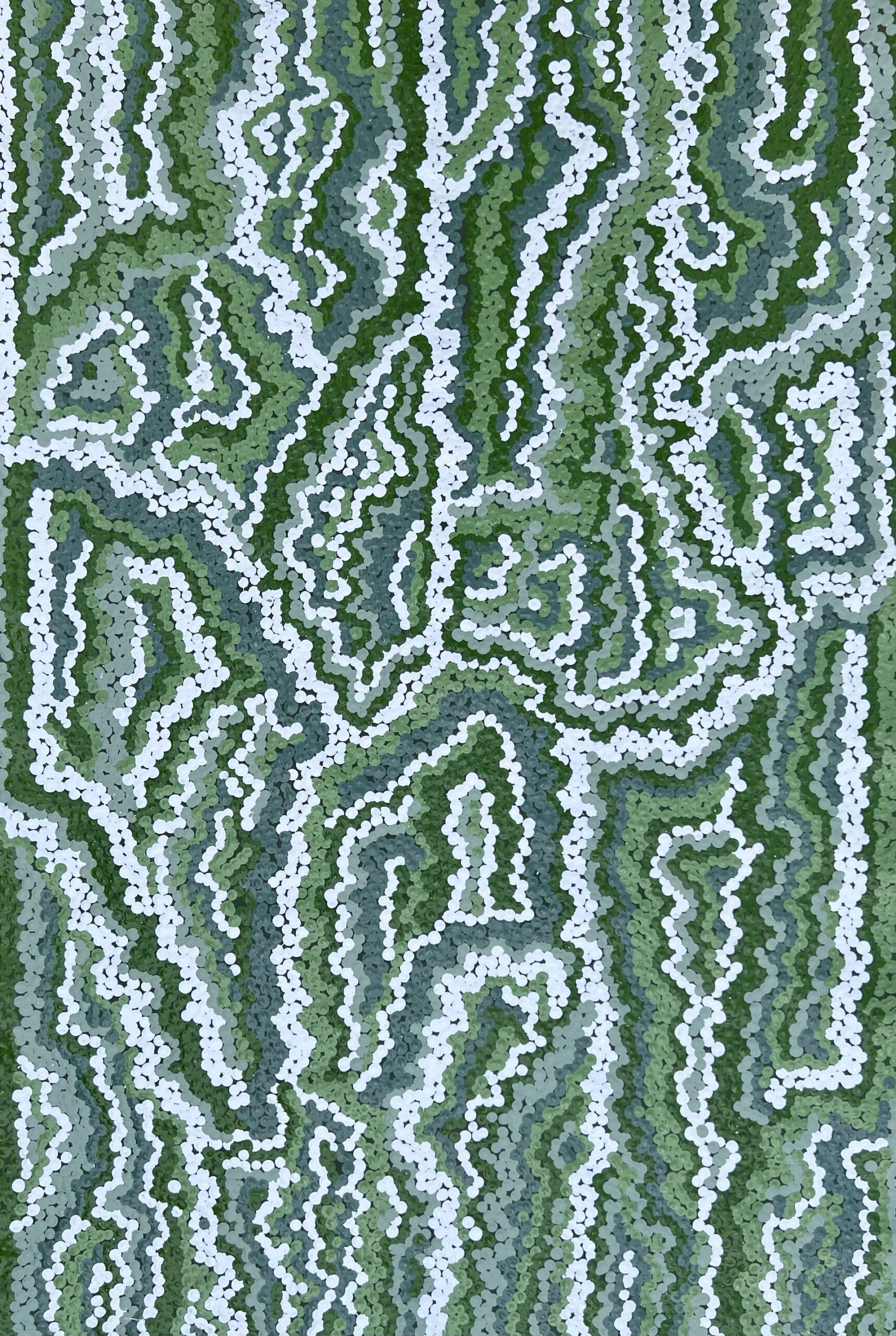In this series, Jade paints her Country as though viewed from above, the tracklines stretching across the canvas like veins that bind people, story, and land together. These pathways form a talking map, recording the journeys of her ancestors and the routes that remain central to community life. By setting them down clearly, she creates a powerful aerial view of Country that speaks openly to memory, identity, and belonging.