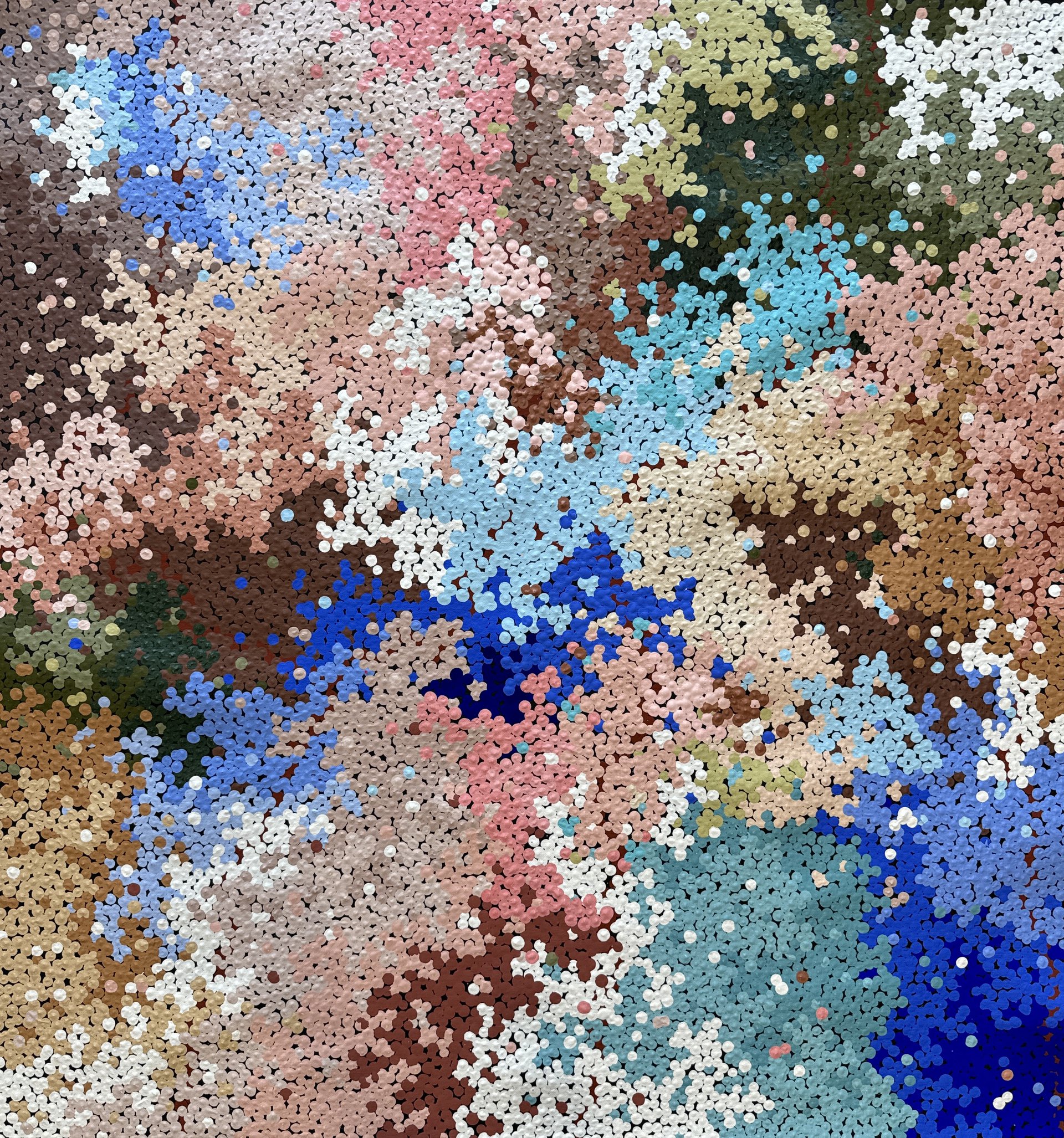 Beginning with the same foundation of tracklines, this series introduces a protective veil. Once the routes are marked, Jade layers them beneath imagery that recalls the land’s renewal—wildflowers pushing through the earth, Country breathing after rain or fire. What lies beneath is never erased but carefully held, safeguarded by surface patterns of beauty and life.