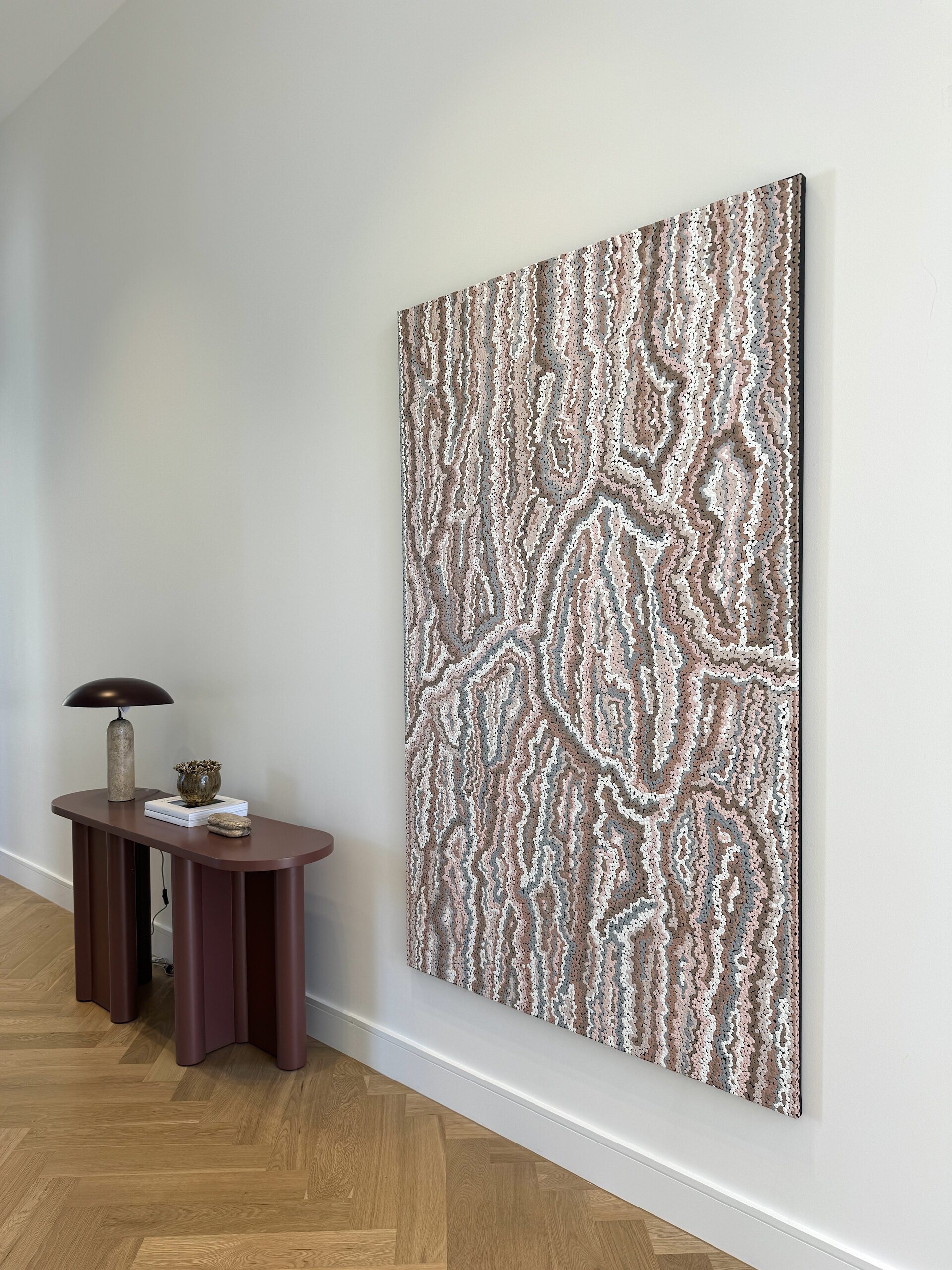The works are both a cultural record and a visual tribute. Each trackline embodies ancestral knowledge, preserving the maps of movement, ceremony, and connection across generations. Through this clarity, Jade continues her family’s tradition of painting Country in a way that is both deeply rooted in heritage and resonant for the present.