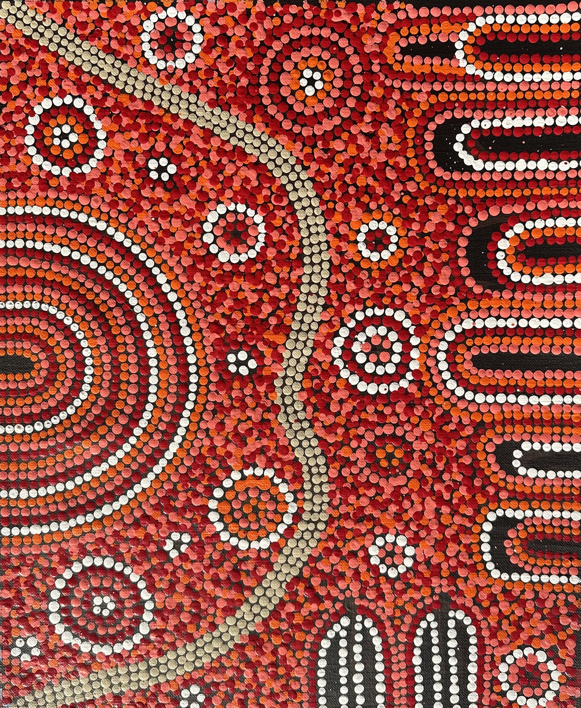 Mariah’s paintings represent the dreaming of their families country is ‘Atnwengerrp’ titled ‘Awelye – Teaching Awelye to young girls’.