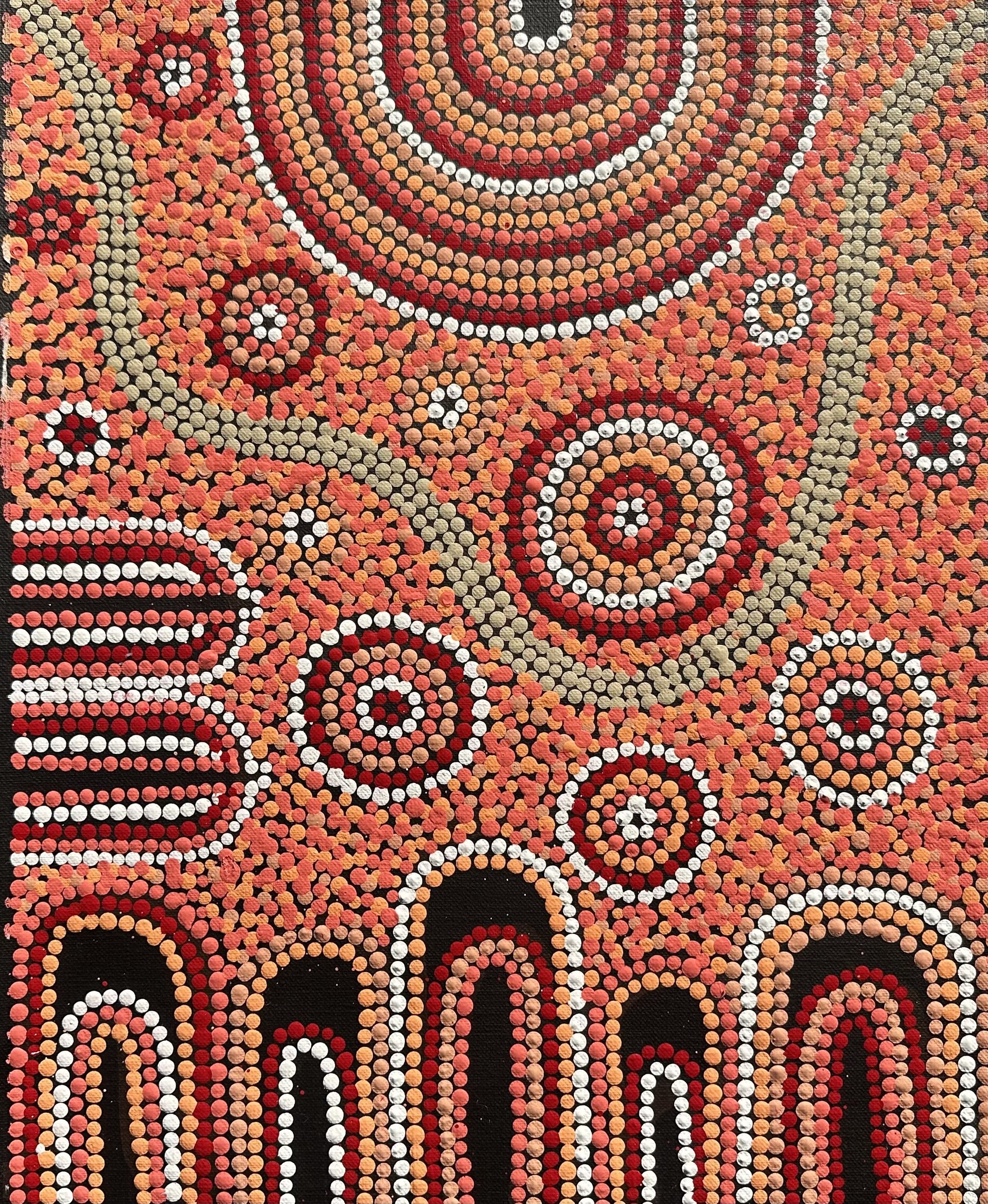 Mariah’s paintings represent the dreaming of their families country is ‘Atnwengerrp’ titled ‘Awelye – Teaching Awelye to young girls’.