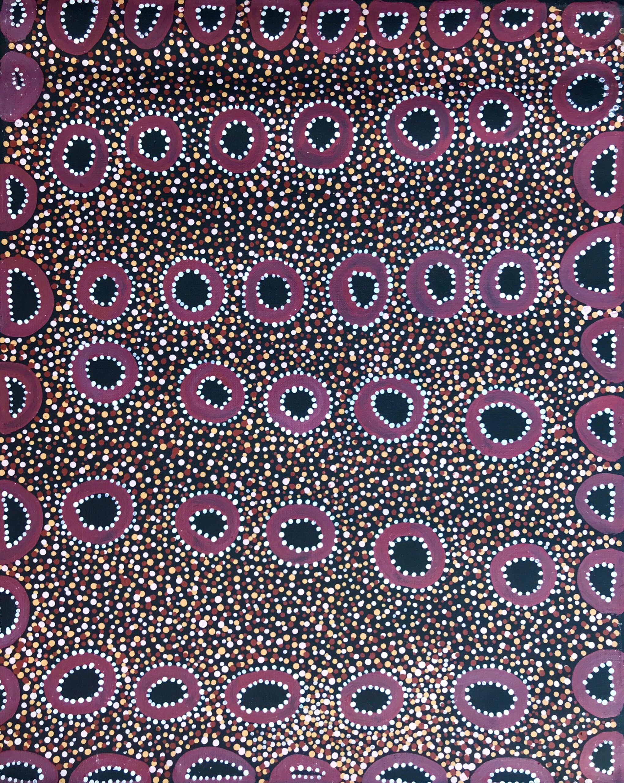 Bush Tucker Dreamings (such us Bush Berry Dreaming, Bush Tomato Dreaming, Bush Orange Dreaming …) references the search for bush tucker across the Central Desert landscape. Bush tucker is freely available for those who know where to look. Learn more here.