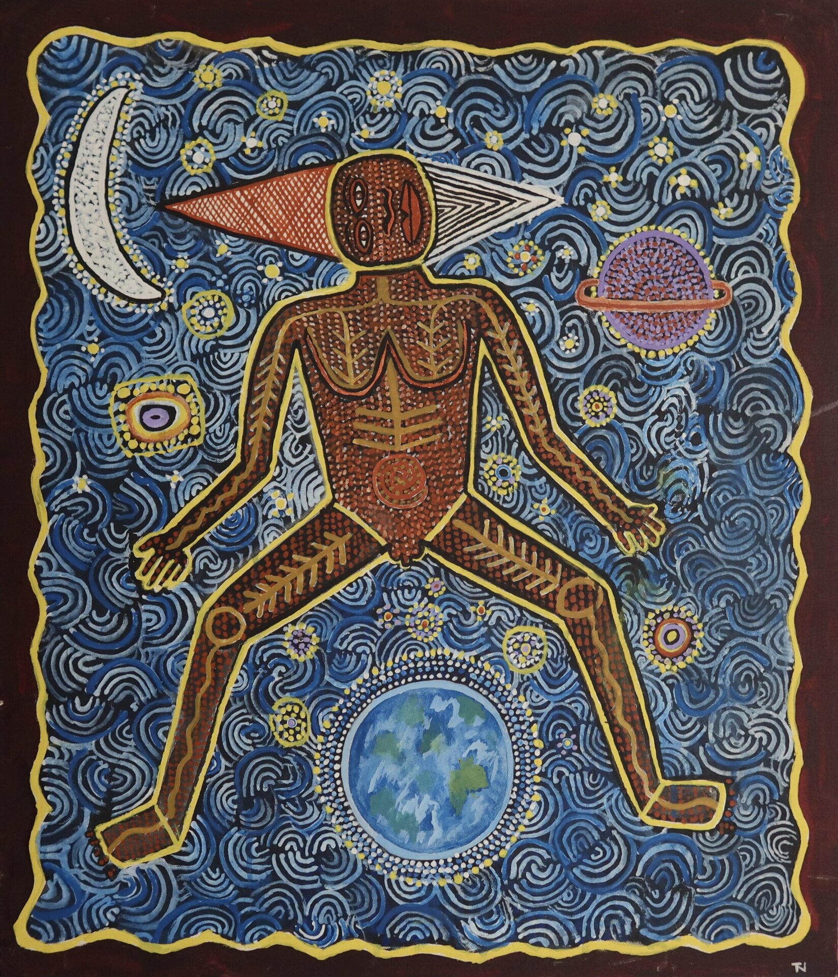 Trevor Nickolls (1949–2012) was a pioneering Ngarrindjeri artist from Adelaide whose work helped shape the field of urban Aboriginal art in Australia. Trained at the South Australian School of Art and later at the Victorian College of the Arts, he developed a distinctive visual language that blended traditional Aboriginal iconography with contemporary imagery. Influenced early on by senior Pintupi painter Dinny Nolan Tjampitjinpa, Nickolls experimented with dotting, cross-hatching, and symbolic motifs while responding to the social and cultural shifts of post-war Australia.