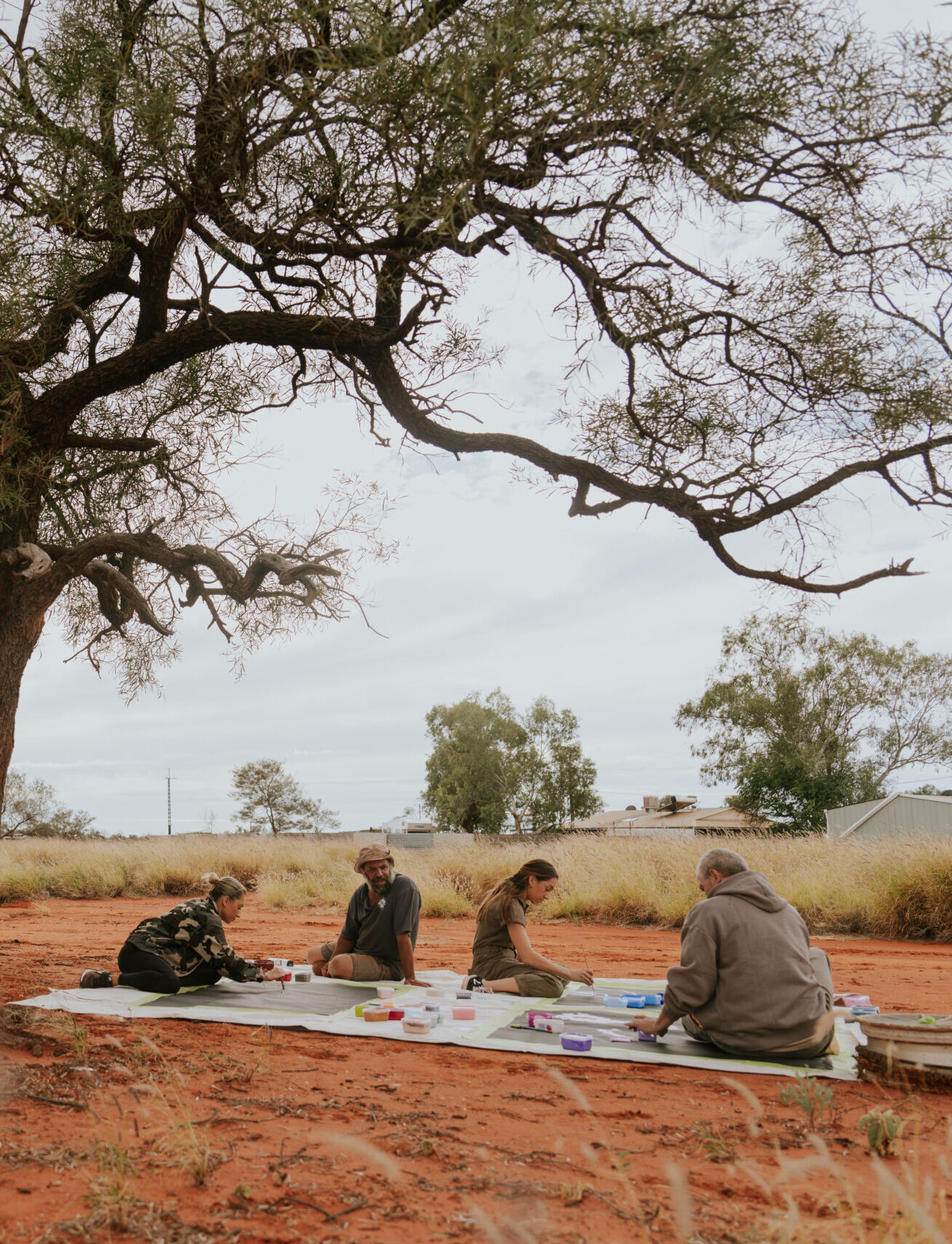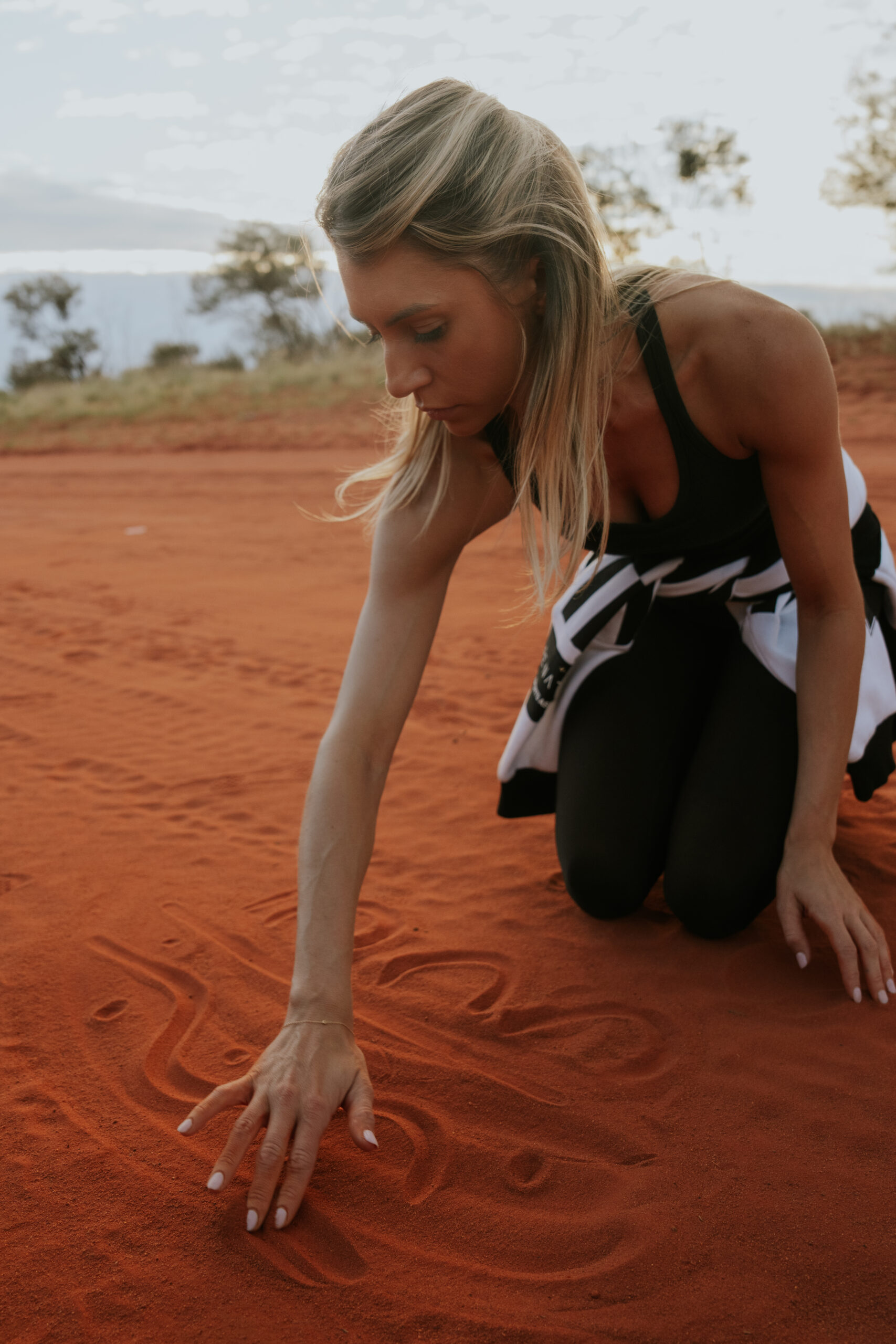 Her design featured her signature loose dotting technique, layered in flowing patterns that mirrored both the rippling currents of water and the aerial views of her homeland, Atnwengerrp, in the Utopia region of the Northern Territory. The deep blues and luminous whites evoked the serenity of the ocean, while intricate motifs paid homage to women’s ceremonial Dreamings passed down from her grandmother, the late Barbara Weir, and great-grandmother, Minnie Pwerle.